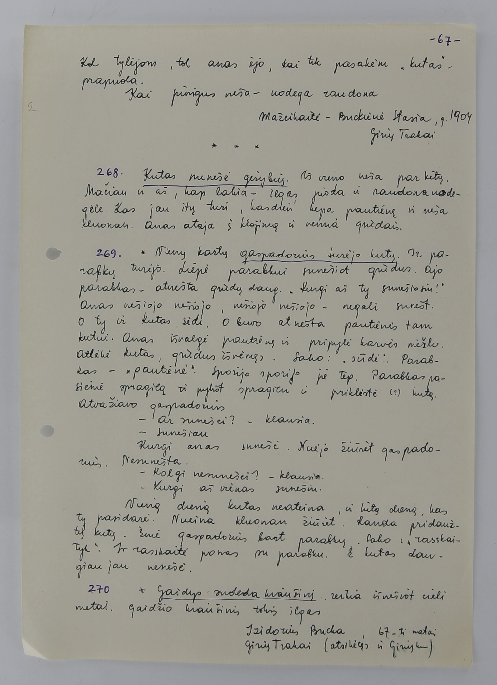 Redaguotas tekstas: Laikydavo juodą katiną pirkaitėj, kur bulves laikydavo. Iškepdavo kiaušinienę. Jis eina į darbą, vakare pareina – javų prinešta. Kartais kap šermuonėlis atrodydavo.