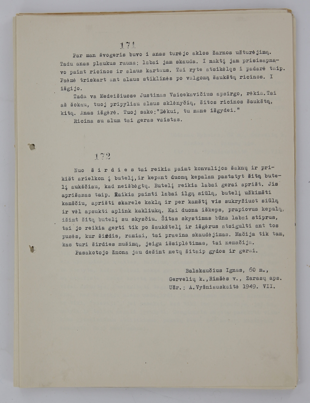 Redaguotas tekstas: Par man švogeris buvo i anas turėjo aklos žarnos užturėjimą. Tadu anas plaukus rauna: labai jam skauda. I naktį jam prisisapnavo paimt ricinos ir alaus kartaus. Tai ryte atsikėlęs i padarė taip. Paėmė triskart ant alaus stiklinės po valgomą šaukštą ricinos. I išgijo.