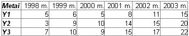 Pavyzdžiui, skaičiuoklės parengta lentelė (duomenys pateikti jos eilutėse, analogiškai duomenis galima pateikti ir lentelės stulpeliuose).